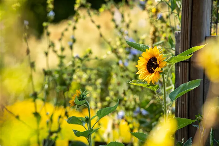 Sonnenblumen sind wahre Stars im Garten. Zusammen mit anderen Sommerblühern sorgen sie für gute Laune und ausgelassene Stimmung. Kein Wunder also, dass sie in nahezu jedem Garten zu finden sind. Die unterschiedlichen Arten und Sorten ermöglichen mit ihrem Aussehen sogar, dass der ganze Garten mit den hübschen Sommerblumen geschmückt werden kann. Und nicht nur im Bauerngarten sind sie ein fester Bestandteil. Auch in Präriegärten und Naturgärten sind sie sehr beliebt. Besonders praktisch sind die großen Sorten für die Begrünung von Zäunen und als Sichtschutz. Zwar muss man diese Sonnenblumen jedes Jahr erneut aussäen, aber sie sorgen damit immer wieder für blühende Highlights. Was die Blüten noch außergewöhnlich macht? Sie richten sich immer nach der Sonne und drehen ihre Blüten der Sonne entgegen. Das sollte man bei der Standortwahl beachten und den Pflanzen im wahrsten Sinne des Wortes einen Platz an der Sonne gönnen. Auch auf dem Balkon ist das wichtig, damit sich die Pflanzen gesund und prächtig entwickeln. Wichtig ist beim sonnigen Standort aber eine ausreichende Bewässerung. Mit Trockenheit kommen die Sommerblumen nämlich nicht zurecht. Auch Staunässe gilt es zu vermeiden. Daher sollten Kübel immer über ein Abzugsloch verfügen, durch das überschüssiges Wasser abfließen kann.